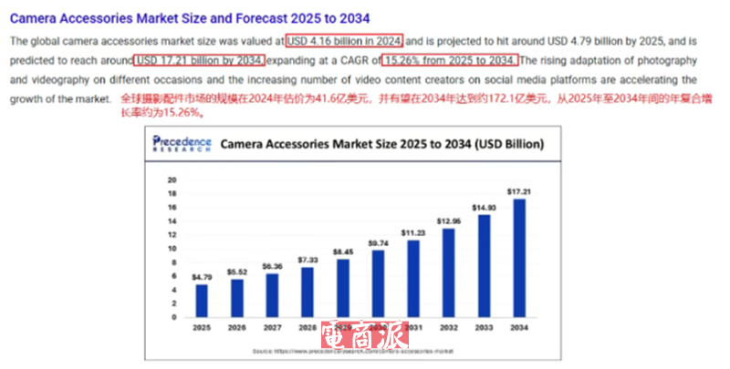 Precedence Research的數據就顯示,2024年全球攝影配件市場的規模已經達到41.6億美元,預計到2034年,該數值將進一步增長至172.1億美元,2025年至2034年期間的年復合增長率約為15.26%。