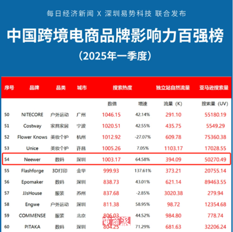 他就是攝影配件大賣Neewer。在每日經濟新聞與深圳易勢科技聯合發布的《中國跨境電商品牌影響力百強榜》(2025年一季度)上,Neewer憑借其強大流量和卓越成就成功躋身榜單第54名,為深圳跨境圈增添了一份榮光。