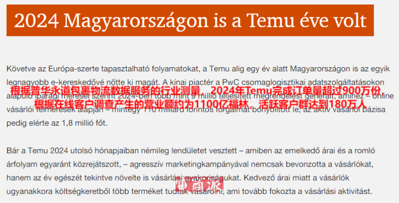 再比如匈牙利,市場(chǎng)研究公司普華永道的數(shù)據(jù)顯示,2024年Temu匈牙利訂單量超過(guò)900萬(wàn)份,營(yíng)收約為1100億福林(約合2.7億歐元),幾乎占據(jù)匈牙利三分之一的跨境電商收入。2024年,匈牙利進(jìn)口電商收入約為3300億福林(約合8.1億歐元)。