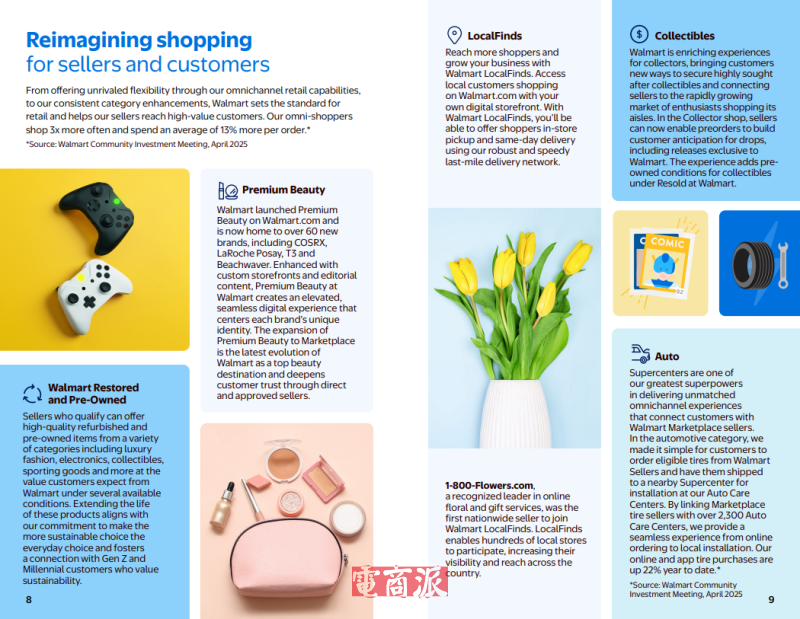 在品類拓展方面,沃爾瑪將“高端美妝”設為重點,新增包括COSRX、La Roche-Posay、T3等60多個品牌,設立定制品牌頁面并輔以內容編輯,提升品牌展示體驗。在“收藏品”領域,沃爾瑪平臺支持預售機制,推出“Resold at Walmart”標簽,允許上架二手收藏品。汽車品類與2300多家線下Auto Care Center聯動,實現線上購胎、線下安裝的全渠道服務模式,截至2025年4月,輪胎銷售同比增長22%。