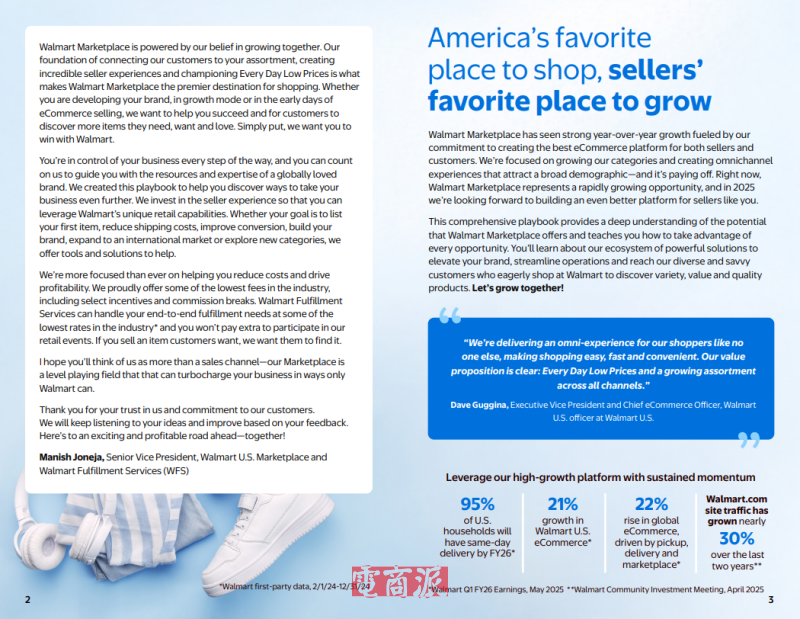 7月5日消息,沃爾瑪近日發布《2025 Marketplace賣家運營手冊》,全面概述了其在履約服務、國際拓展、廣告解決方案和賣家支持計劃方面的最新戰略,旨在進一步提升平臺競爭力、擴大全球市場份額并助力賣家實現增長。這份手冊由沃爾瑪美國Marketplace與沃爾瑪履約服務高級副總裁Manish Joneja及電子商務執行副總裁Dave Guggina主導,針對2025財年的整體發展方向提供了詳細指引,并涵蓋從畢業季到年末促銷季的高峰期運營建議。