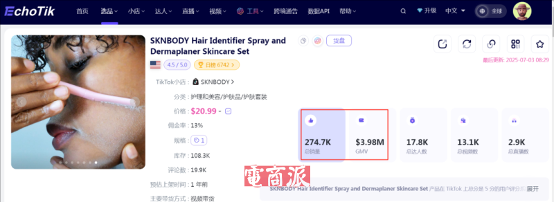 Akunbem便是其中一員,專門針對女性市場研發了一款電動剃須刀產品,銷售異常火熱。根據Echotik統計的數據,Akunbem女士電動剃須刀在近30天賣出了70000多件,累計銷售額達到130萬美元。主打女性面部胡須、毛發和死皮清理的品牌SKNBODY同樣吃到了蛋糕,其針對女性市場推出了一款面部剃須、脫毛噴霧套裝剛上架就賣爆,截至目前,已經在TikTok吸金398萬美元。