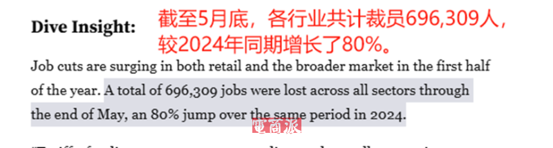 Challenger, Gray & Christmas的數據就指出,今年上半年,包括零售業在內的美國整體市場的裁員數量都在激增。截至5月底,美國各行業共計裁員數量已經接近70萬人,對比2024年同期增長了80%。