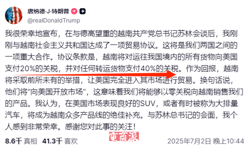 當地時間7月2日,特朗普就在社交軟件“真相社交”上宣布,美國已和越南達成一份貿易協定,越南將對美國商品實行零關稅政策,美國則對越南進口的商品征收20%關稅,并對從越南轉運的商品征收40%的關稅。零關稅對20%-40%關稅,這份協議的不平等顯而易見。