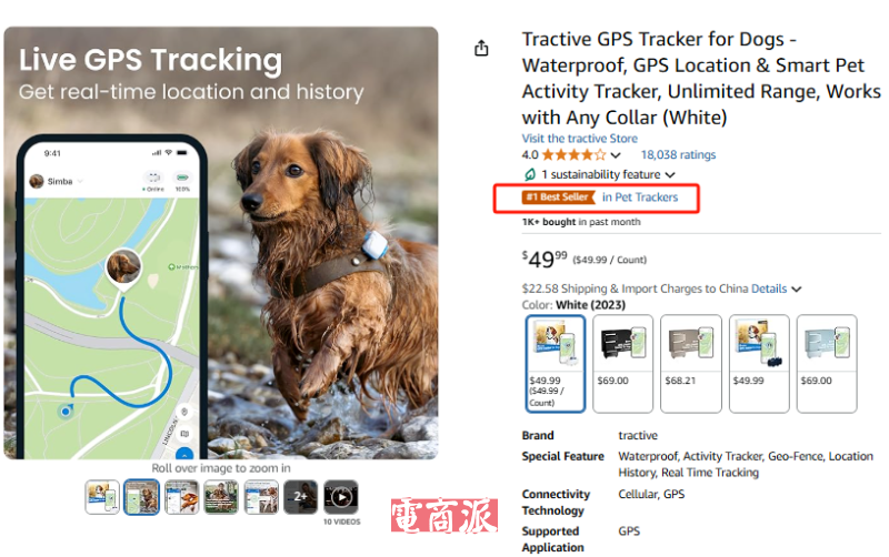 例如此前,在亞馬遜美國站上就有一款寵物追蹤器脫穎而出,曾獲得一個月售出幾千多單,銷售額超22萬美金,一舉沖上亞馬遜Pet Trackers類目第一的好成績。該產品擁有實時GPS跟蹤系統,范圍不受限制且每2-3秒更新一次;可設置安全區,如果寵物離開就會發出警報;同時還可檢測寵物的日常健康狀況、睡眠模式等,深受寵物主人的喜愛。