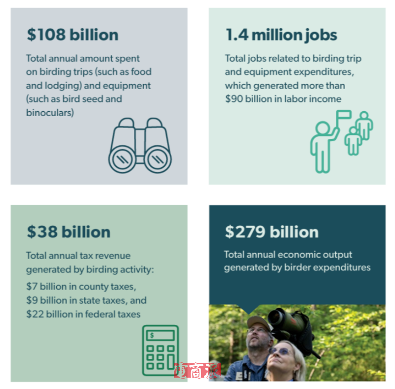說起觀鳥,雖然國內對該活動的喜愛的人還算不上太多,但在美國市場更是火熱,幾乎可以說成為一項主流活動。據State of the Birds在2025年發布的最新報告,美國有近1億觀鳥愛好者,約占成年人口的三分之一以上,而這些愛好者每年在觀鳥旅行及設備上的總支出高達1080億美元,約合7748億人民幣,足見這一市場的消費活力。