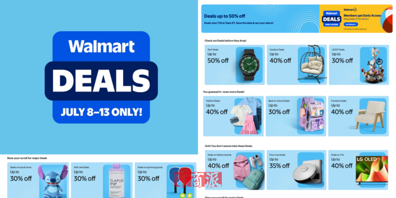 另一大原因便是市場競爭,比如沃爾瑪夏季特賣活動也在7月舉行(7.8-7.13),而且活動時間與亞馬遜Prime Day重疊,同一天開場,晚兩天閉場。這期間,沃爾瑪提供的優惠也足夠亮眼,部分戶外、科技等品類產品折扣達50%。