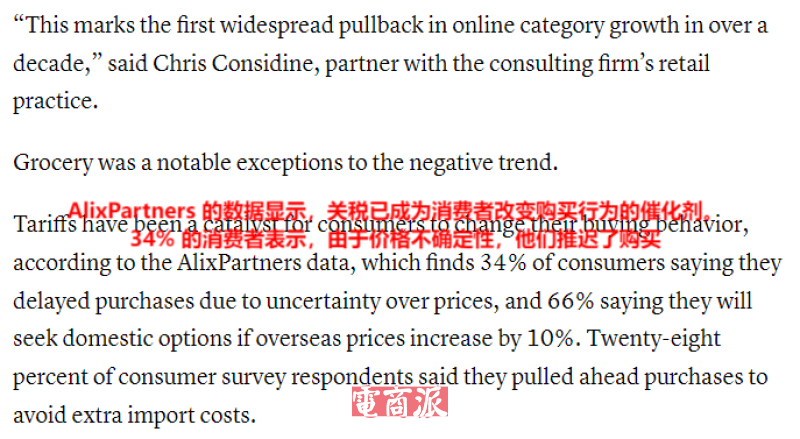美國咨詢公司Alix Partners發布的調查報告就顯示,關稅政策變化在一定程度上改變了消費者的網購行為,大約34%的受訪者表示,由于關稅導致的價格不確定性,他們普遍延遲了一些本來要做的購買決定。