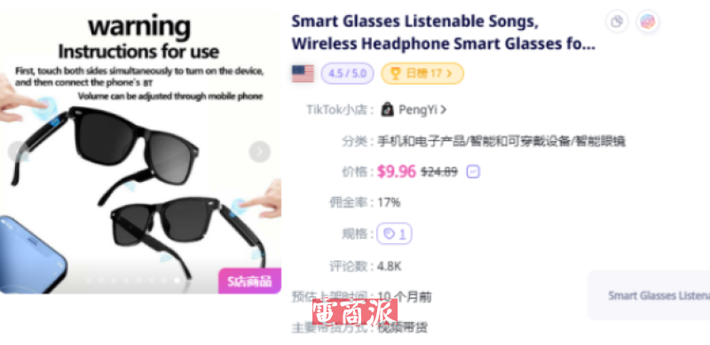 比如此前,TikTok美區有一款售價在10美元左右的智能墨鏡十分火爆,單月銷量近5萬件,單日最高賣出近4000件,一個月的流水差不多50萬美金。