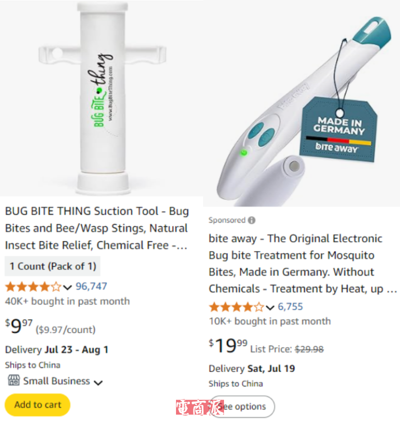 除了蜻蜓模型,現階段驅蚊貼、驅蚊手環等驅蚊神器同樣迎來銷量飆升,其中有兩大產品值得關注,分別是吸盤工具和叮咬治療儀。這兩款產品都是被蚊蟲叮咬之后使用的工具,雖然功能相同,但實現路徑不同。最重要的是,這種實現路徑可以作為賣家推廣產品,打出爆款的營銷亮點。