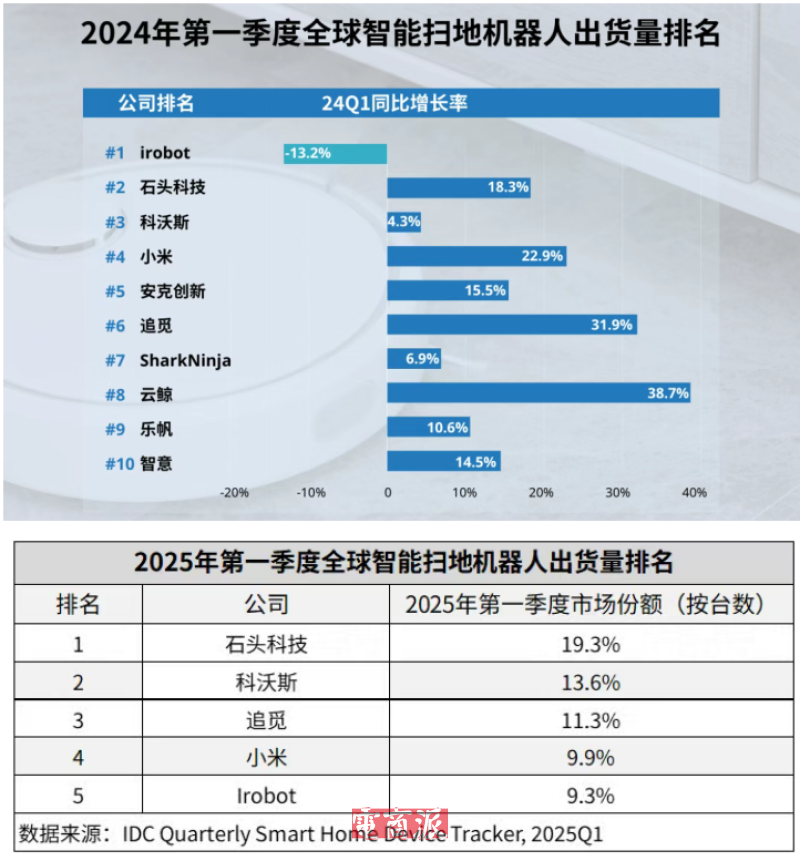 與2024年同期相比,這一市場格局有所變化,但整體上,中國廠商五占四的格局分布沒有變化。反而是石頭科技、科沃斯、小米、追覓四者排名有所提升,將美國頭部品牌Irobot擠至第五席位。
