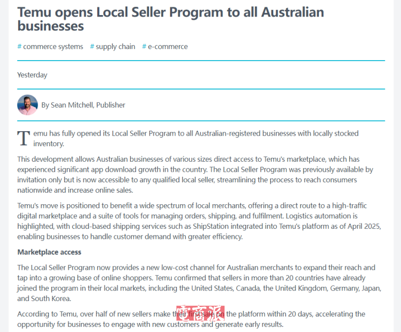 7月16日消息,TEMU近日全面開(kāi)放澳大利亞“本地賣(mài)家計(jì)劃”,允許擁有本土庫(kù)存的澳企入駐其全球電商平臺(tái)。該計(jì)劃原為邀請(qǐng)制,但現(xiàn)在所有符合條件的本地賣(mài)家均可參與,從而簡(jiǎn)化了覆蓋全國(guó)消費(fèi)者并提升在線銷(xiāo)售額的流程,旨在幫助實(shí)體零售商轉(zhuǎn)型線上。數(shù)據(jù)顯示,TEMU澳洲站2024年獨(dú)立訪問(wèn)量增長(zhǎng)72%,位居iPhone下載榜首,Similarweb報(bào)告更將其列為2025年澳大利亞增長(zhǎng)最快的網(wǎng)站。