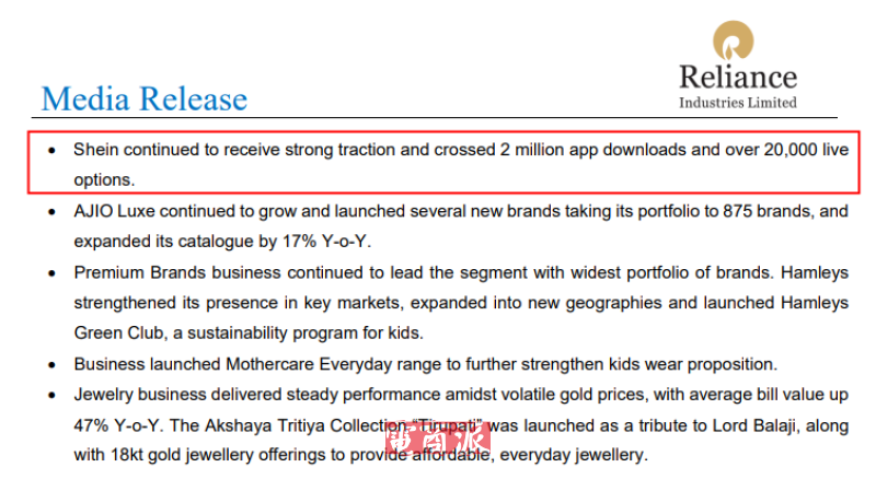 7月22日消息,信實工業集團(Reliance Industries)最新發布的財報顯示,SHEIN印度版應用程序在重新上線六個月內,已突破兩百萬次下載,平臺目前提供超過兩萬個在線商品選項。SHEIN于2025年2月重新登陸印度市場,通過與信實零售(Reliance Retail)達成的許可合作協議運營,由信實零售全資子公司Nextgen Fast Fashion獨家負責產品制造、銷售和市場運營。