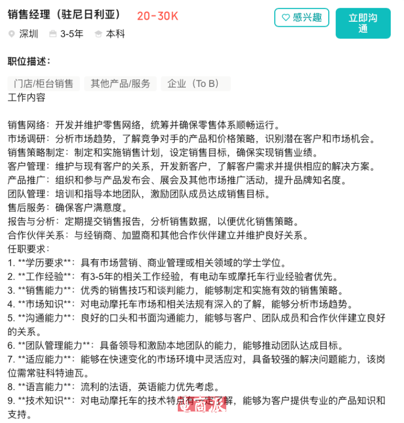 此外,今年6月,知情人士透露,傳音還有意發展電動車業務。招聘平臺信息顯示,傳音已啟動相關崗位招聘,如出行業務負責人、業務合伙人、硬件產品經理等,工作地點涵蓋埃及、肯尼亞、坦桑尼亞等非洲國家。