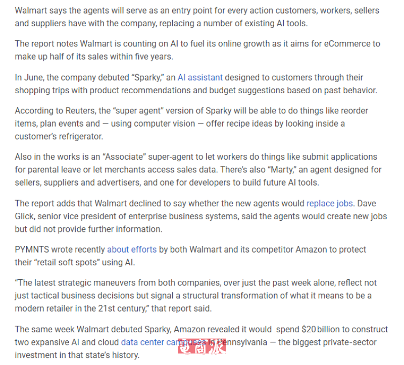 除面向消費者的Sparky外,沃爾瑪還在開發面向員工的“Associate”超級智能體,預計將在未來數月推出。該系統可協助員工提交育兒假申請、快速訪問特定商品類別的銷售數據等,替代當前依賴多個獨立AI工具的操作方式。