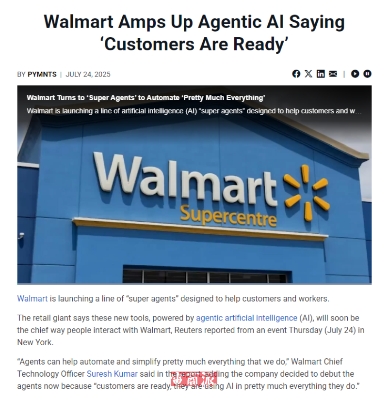 7月25日消息,沃爾瑪宣布,即將推出一套基于“Agentic AI”(自主智能體)的人工智能“超級智能體”系統,服務對象涵蓋消費者、員工、供應商、第三方賣家及軟件開發人員,旨在全面優化購物體驗與企業運營效率,進一步推動電商業務的增長。這四個“超級智能體”將取代沃爾瑪目前所使用的多個AI工具和應用,成為所有AI交互的統一入口。
