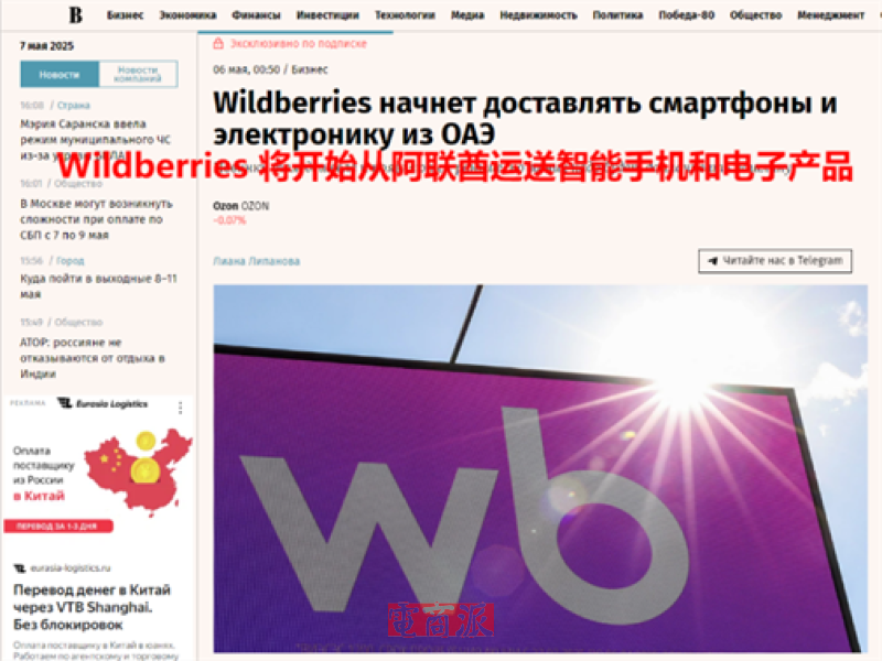 今年上半年,Wildberries代表就透露,首批阿聯酋賣家已經完成平臺注冊,Wildberries將于5月開始銷售來自阿聯酋賣家的商品。從此之后,任何Wildberries提貨點都可以接收來自阿聯酋的貨物,預計配送時效在六天左右,但具體情況可能因庫存容量或清關程序等因素發生變化。