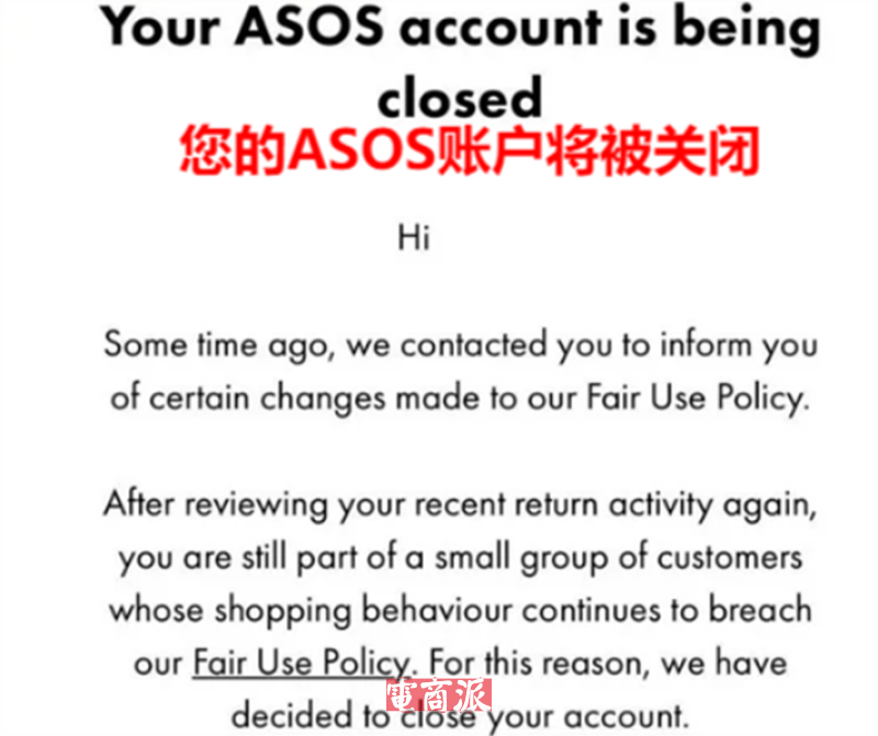 比如,英國在線時尚巨頭ASOS近期就向一批高退貨率顧客發送了封號郵件,稱由于這些顧客違反了平臺的合理退貨規定,因此ASOS將在30天內關閉他們的買家賬戶,即使他們選擇重新創建賬戶,也會被平臺屏蔽。