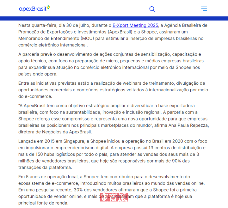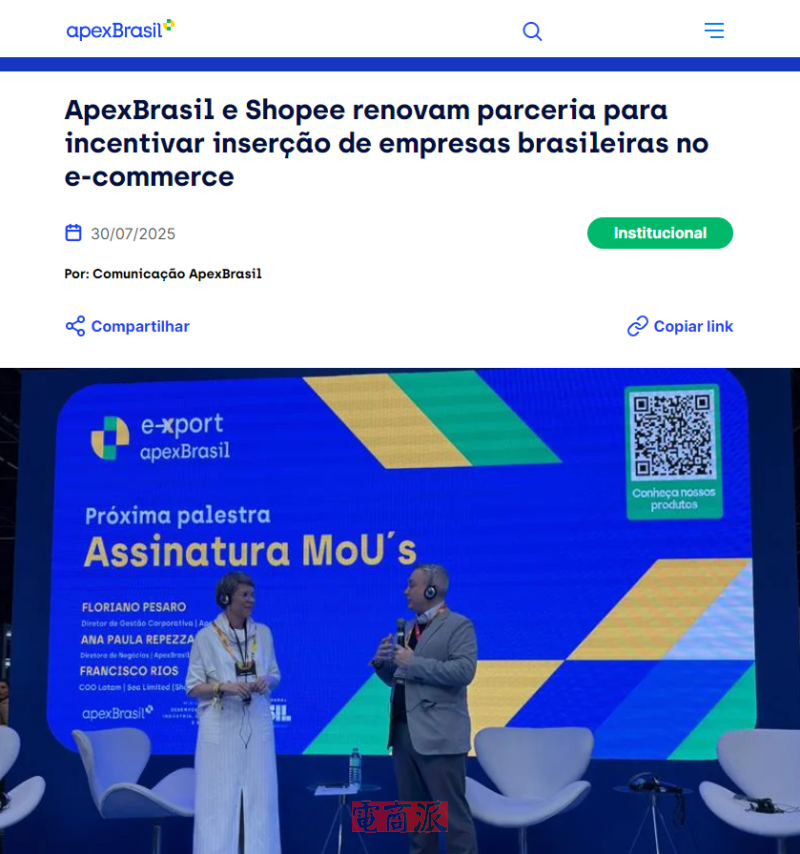 7月31日消息,Shopee與巴西國(guó)家出口促進(jìn)機(jī)構(gòu)ApexBrasil簽署合作諒解備忘錄(MoU),旨在助力巴西微型與小型企業(yè)進(jìn)軍東南亞電商市場(chǎng)。根據(jù)合作協(xié)議,雙方將聯(lián)合開展宣傳、培訓(xùn)和技術(shù)支持行動(dòng),重點(diǎn)幫助巴西中小微企業(yè)通過Shopee平臺(tái)在其運(yùn)營(yíng)國(guó)家拓展國(guó)際電子商務(wù)業(yè)務(wù),計(jì)劃舉措包括舉辦培訓(xùn)網(wǎng)絡(luò)研討會(huì)、發(fā)布商業(yè)機(jī)會(huì)信息,以及提供跨境電商國(guó)際化戰(zhàn)略內(nèi)容等。