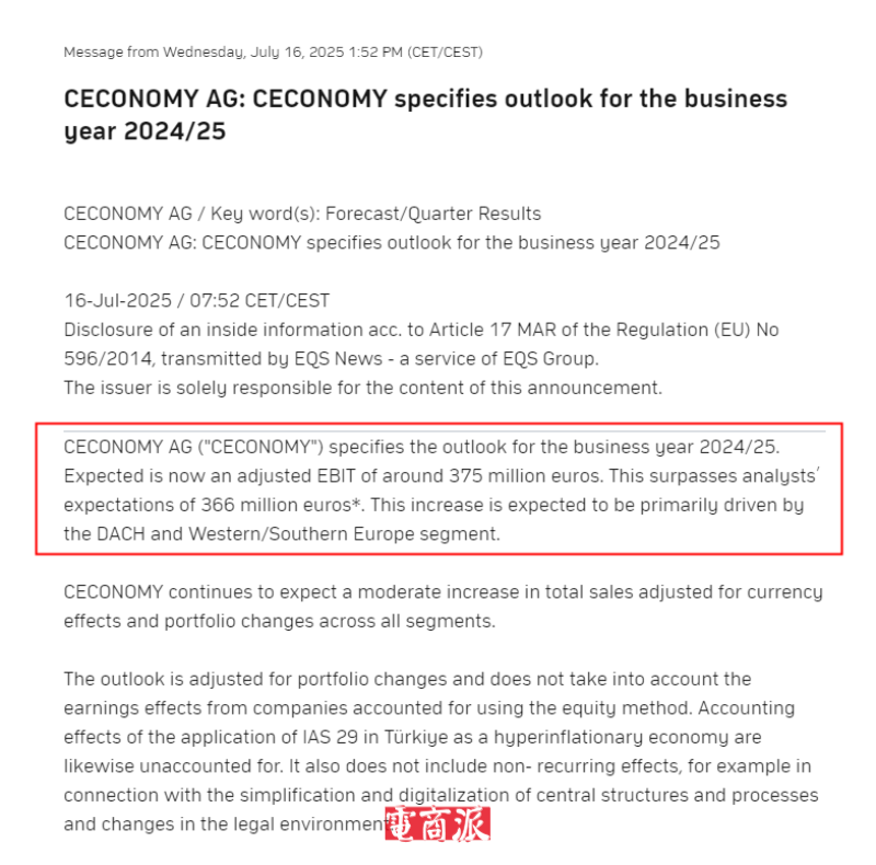 而就在京東出手的不久前,Ceconomy還曾公布2024/25財年業績展望,預計經調整息稅前利潤將達3.75億歐元,折合約30.89億人民幣。