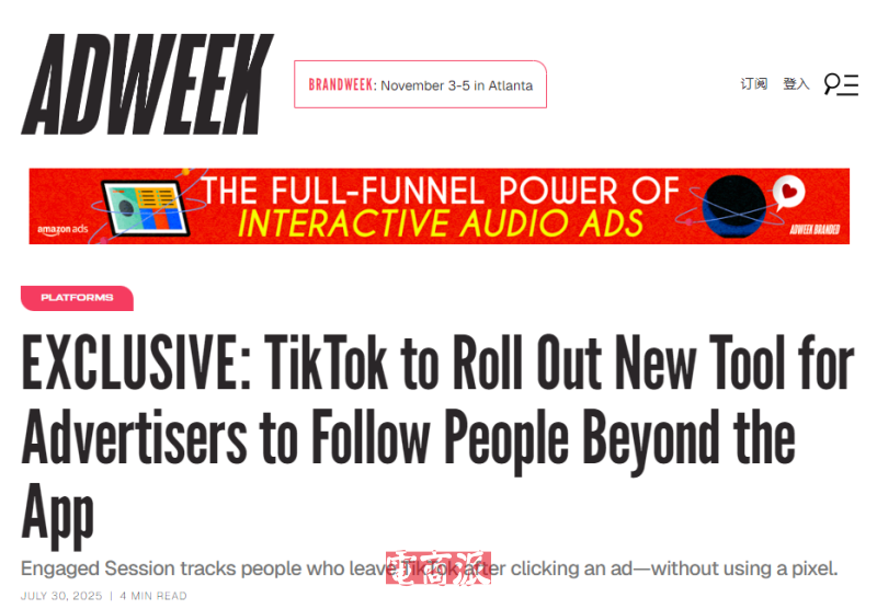 8月2日消息,TikTok即將推出一款全新廣告工具——“互動會話”(Engaged Session),無需依賴像素技術,就能對用戶離開應用后的行為進行追蹤。在社交媒體廣告領域,普遍存在的痛點就是用戶點擊行為難以直接轉化為有效的網站互動。而“互動會話”功能的出現將有效填補這一空白。它將幫助廣告商定位那些點擊廣告后,在網站或零售商落地頁停留超過10秒的用戶,為廣告商提供更深入的點擊后行為洞察。