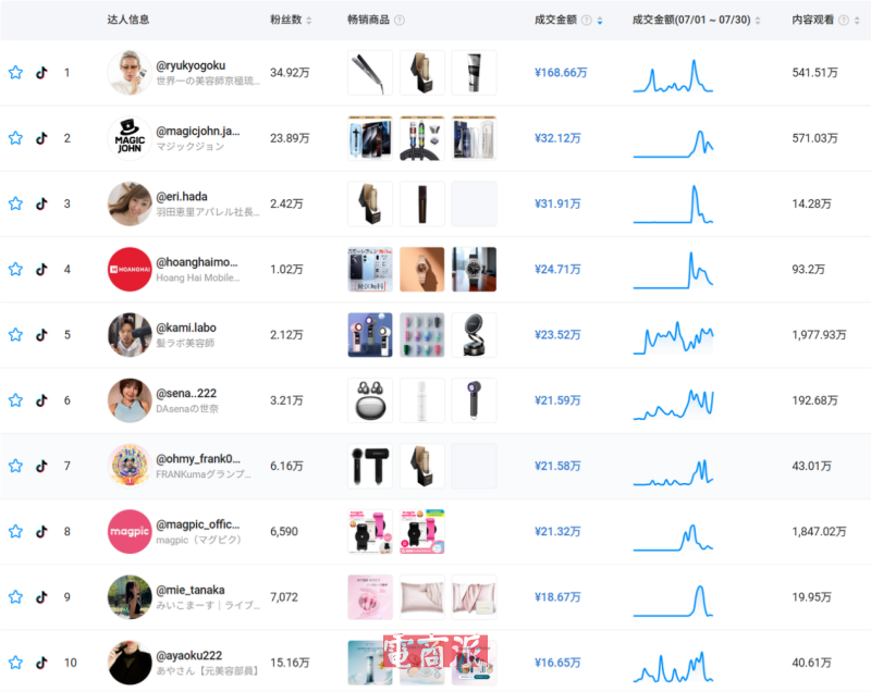 帶貨GMV最高的Top10達人 圖源:Kalodata