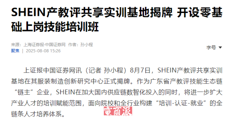 8月8日消息,SHEIN產教評共享實訓基地日前在其服裝制造創新研究中心正式揭牌。作為廣東省產教評技能生態鏈“鏈主”企業,SHEIN在加大國內供應鏈數智化投入的同時,將進一步擴大產業人才的培訓賦能范圍,面向院校和全行業構建“培訓-認證-就業”的全鏈條人才培養體系,以“技能引擎”助力產業的數字化、智能化、綠色化升級,為傳統“制造”向“智造”的躍升注入“源頭活水”。