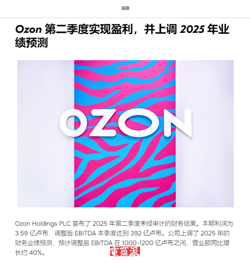 值得一提的是,近日,Ozon公布2025年第二季度財務報告。財報顯示,Ozon二季度總營收達到2276億盧布,同比增長87%;毛利潤同比增長近四倍,達到575億盧布。分業務來看,Ozon二季度電商業務營收1894億盧布,同比增長73%,主要由于服務收入顯著提升;GMV(含服務)達到9584億盧布,同比增長51%;活躍買家數超過6000萬;訂單量增長61%,用戶年均訂單量達30單,同比增長26%。