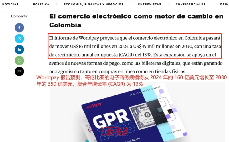 另外,據支付平臺Worldpay此前發布的《2025全球支付報告》顯示,哥倫比亞電商市場一直保持著高增速,從2024年的160億美元增長至2030年的350億美元,復合年增長率(CAGR)達到13%。