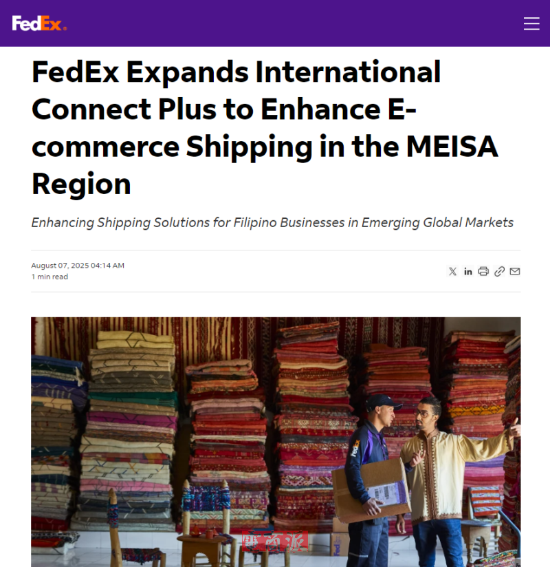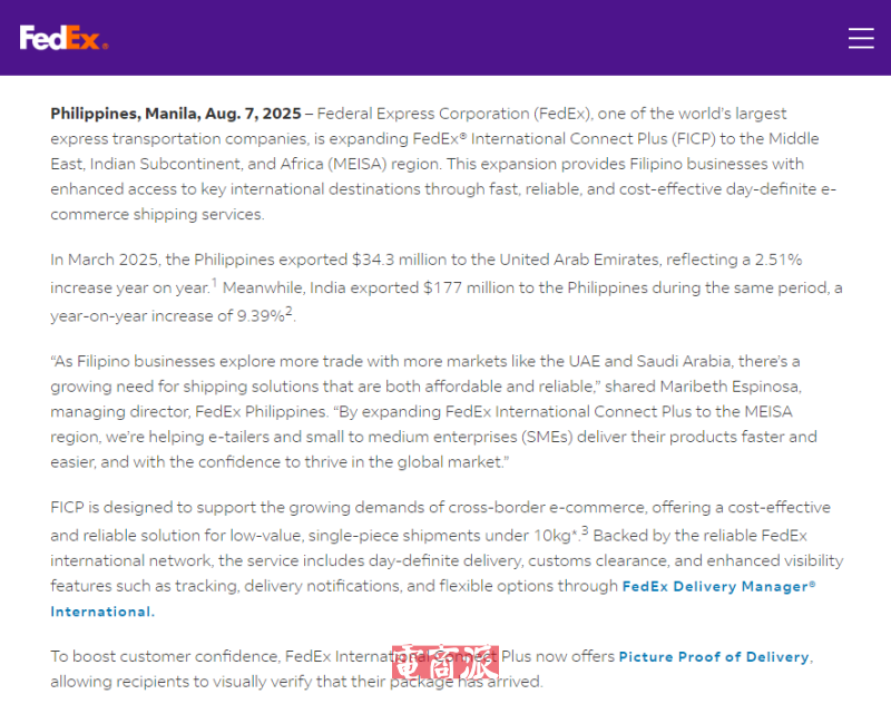 8月12日消息,聯邦快遞(FedEx)近日宣布將其國際快遞加值服務(FICP)服務擴展至中東、印度次大陸及非洲(MEISA)地區,為當地企業提供更具時效性和確定性的跨境電商運輸解決方案。此次擴展將通過快速、可靠且經濟高效的當日電子商務運輸服務,為菲律賓企業提供更便捷的國際目的地配送服務。為了增強客戶信心,FICP還引入了“投遞圖片確認”功能,收件人可通過照片驗證包裹已送達,進一步提升配送透明度與安全性。