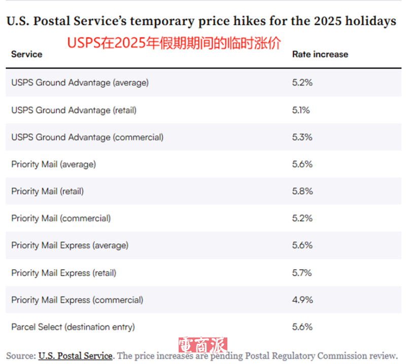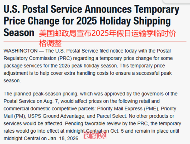 具體來說,USPS此次費率上調將于2025年10月5日起生效,直至2026年1月18日,覆蓋整個假日購物季。