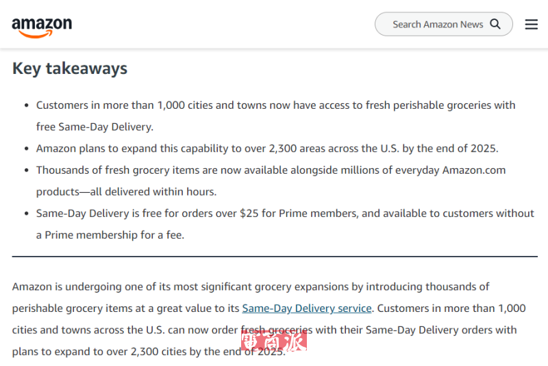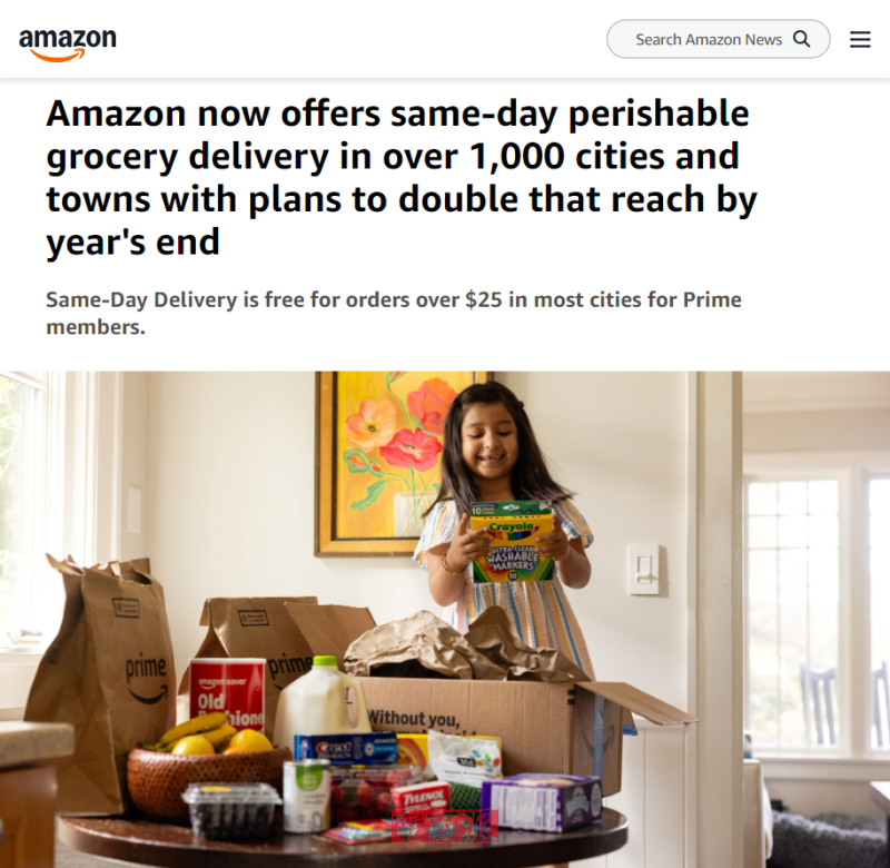 亞馬遜計劃將生鮮當日送達服務擴展至全美2300城鎮
