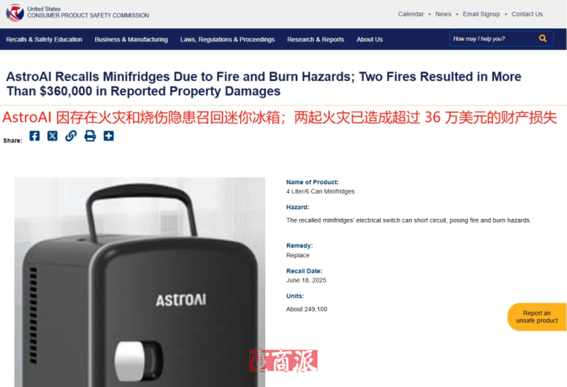 事實上,產品召回的事件并非個例。例如在今年6月,AstroAI的一款迷你冰箱就被通知召回,原因同樣是存在電氣短路風險可能引發火災或造成燒傷。截至召回時,收到至少70起有關該冰箱冒煙、燃燒、熔化或起火的報告,造成了巨大的財產損失。