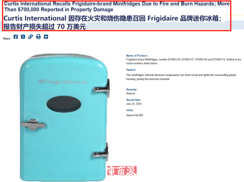 無獨有偶,另一項同樣嚴重的產品安全問題浮出水面,柯蒂斯國際公司進口并貼牌Frigidaire 的特定型號迷你冰箱被緊急召回,涉及 EFMIS129、EFMIS137、EFMIS149、EFMIS175 等型號,召回總量高達634,000臺。至于召回原因,是其內部電氣元件存在致命缺陷,可能短路并引燃周圍塑料部件,給用戶帶來嚴重的火災和燒傷風險。