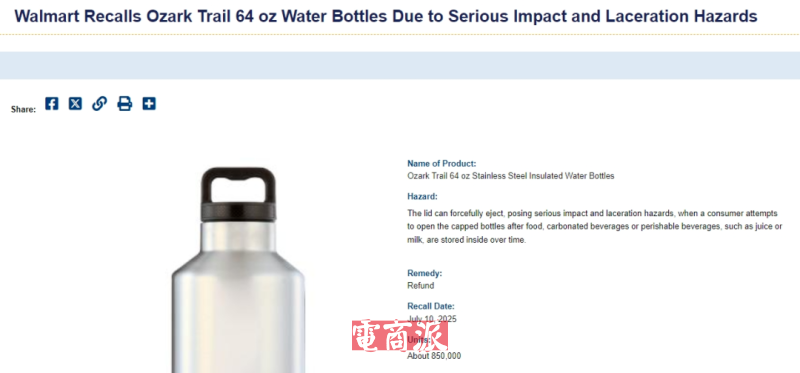 7月初,沃爾瑪聯合CPSC發布了一篇召回公告,召回Ozark Trail 64盎司不銹鋼保溫水瓶(型號83-662),召回數量達到85萬件。原因是產品在設計上的缺陷,瓶蓋與瓶身密封性過強,缺乏壓力釋放機制等。
