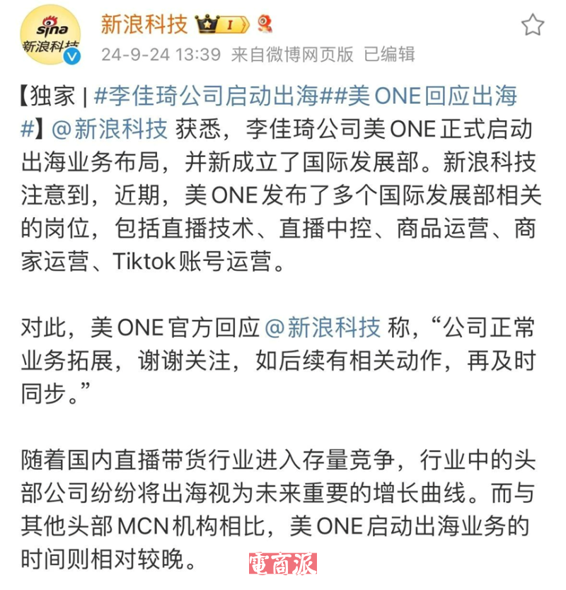 同年9月,李佳琦所屬公司美one成立新國(guó)際發(fā)展部,并在官網(wǎng)上發(fā)布了多個(gè)國(guó)際發(fā)展部相關(guān)的崗位,包括直播技術(shù)、直播中控、商品運(yùn)營(yíng)等。