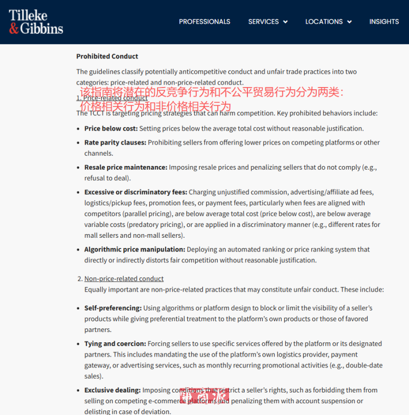 詳細來看,價格相關方面禁止低于成本定價、價格平價條款、轉售價格維持、過高或歧視性的費用、算法價格操縱等行為。可能損害競爭的定價策略是TCCT的重點監管對象,舉例來說,掠奪性定價就是指平臺以低于成本的價格銷售商品或服務,意圖排擠競爭對手,一旦競爭對手被擠出市場,再提高價格獲取壟斷利潤,這種行為嚴重擾亂了正常的市場價格秩序。
