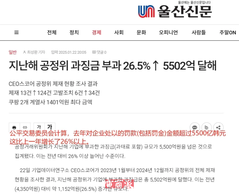 據其公平貿易委員會統計,2024年對企業的制裁數量為124起,處罰對象總數為308家;與此同時,對企業的罰款總額也明顯多了不少,從2023年的4350億韓元增加到5502億韓元,同比增長26.5%。