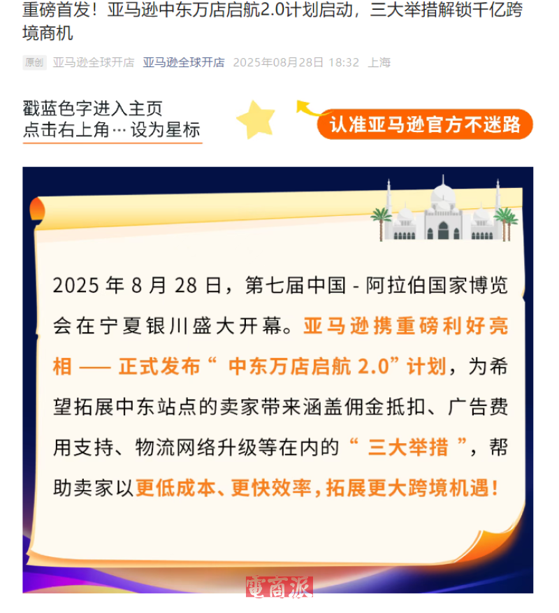 8月31日消息,在寧夏銀川開幕的第七屆中國-阿拉伯國家博覽會上,亞馬遜發布了面向出海中東賣家的“中東萬店啟航2.0”計劃。該計劃覆蓋新賣家激勵、跨境電商供應鏈優化和選品工具創新“三大舉措”,主要包含: