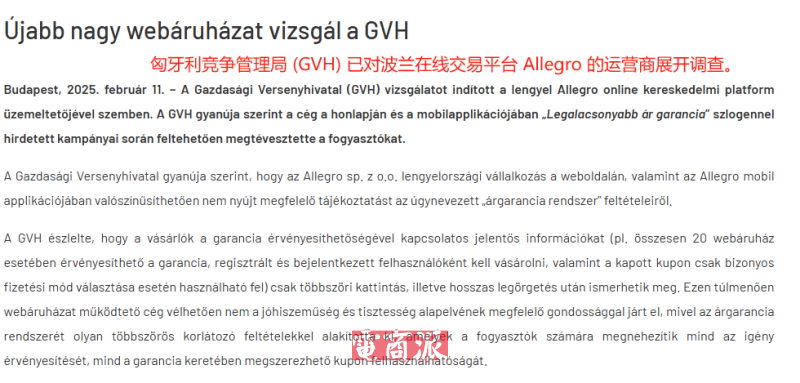 同樣的情形也發生在歐洲電商市場。今年2月,匈牙利競爭管理局(GVH)宣布對波蘭最大電商平臺Allegro展開調查,理由是GVH質疑Allegro可能在其網站和應用程序,用“最低價格保證”的促銷廣告欺騙了消費者。