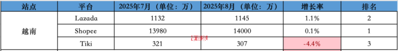 值得注意的是,部分本土平臺(tái)在8月均有下降表現(xiàn)。例如在印尼站點(diǎn),本土電商平臺(tái)Tokopedia訪問量從7月份的6040萬降至8月份的5918萬;而在越南站點(diǎn),本土電商平臺(tái)Tiki的訪問量同樣有所下滑,從7月份的321萬降至8月份的307萬。