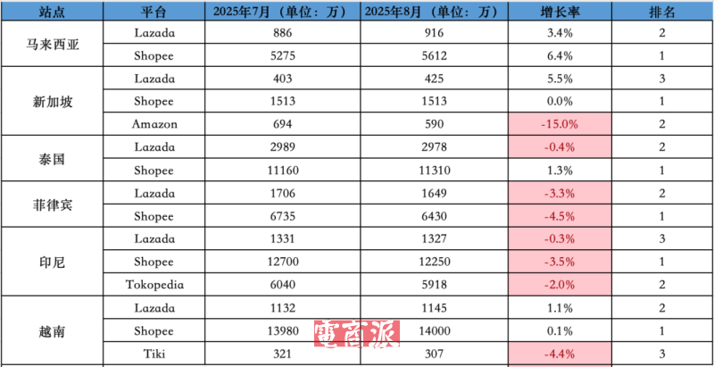 近日,數(shù)據(jù)分析網(wǎng)站Similarweb發(fā)布了2025年8月份東南亞各電商平臺(tái)訪問量(桌面+移動(dòng)),在多個(gè)國家和地區(qū)的訪問量數(shù)據(jù)呈現(xiàn)出一定的變化。