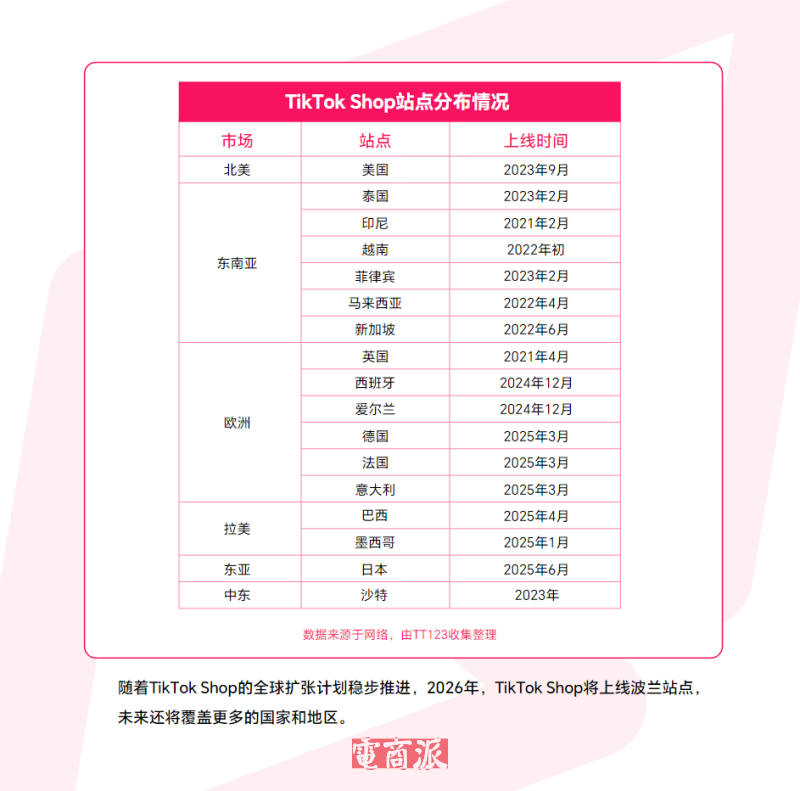 抖音旗下TikTok Shop依托短視頻流量和“內容種草+直播”模式快速起量,吸引了大量追求新鮮購物體驗的用戶,當前其全球站點數量已達到17個。