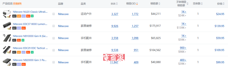 Nitecore產品在亞馬遜熱銷 圖源:賣家精靈