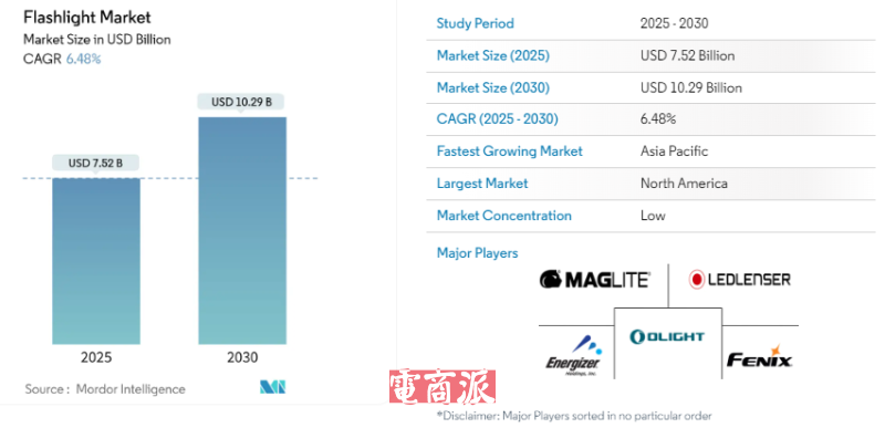 市場研究機構Mordor Intelligence的報告顯示,2025年全球手電筒市場價值估計為75.2億美元,預計到2030年將上漲至102.9億美元,復合年增長率為6.48%。這其中,北美市場貢獻最大份額,亞太市場增速最快。
