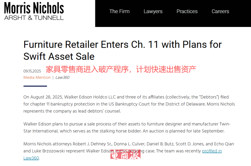 近日,曾憑借電商模式迅速崛起的家居品牌Walker Edison,如今卻步履維艱,最終與三家關聯公司向特拉華州破產法院申請第11章破產保護