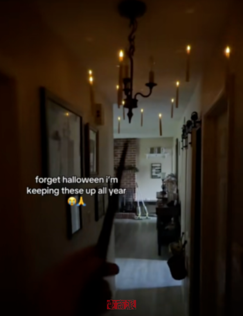 此外,在更早些時候TikTok博主@landeeeno分享了一款過去萬圣節保存的裝飾,得到了大量的關注和喜愛。它采用的是無火焰更加安全,用透明線將蠟燭掛在天花板上,看起來就像是懸浮效果,再搭配上通過“魔法棒”控制亮燈,讓畫面看上去更加玄幻神奇,與萬圣節的氛圍十分吻合。
