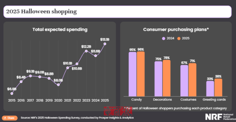 近日,根據美國零售聯合會(National Retail Federation)由Prosper Insights & Analytics進行的年度消費者調查顯示,盡管有79%的消費者預計關稅會推高商品價格,但有73%消費者仍計劃慶祝萬圣節,今年萬圣節的消費預計將達到創紀錄的131億美元。