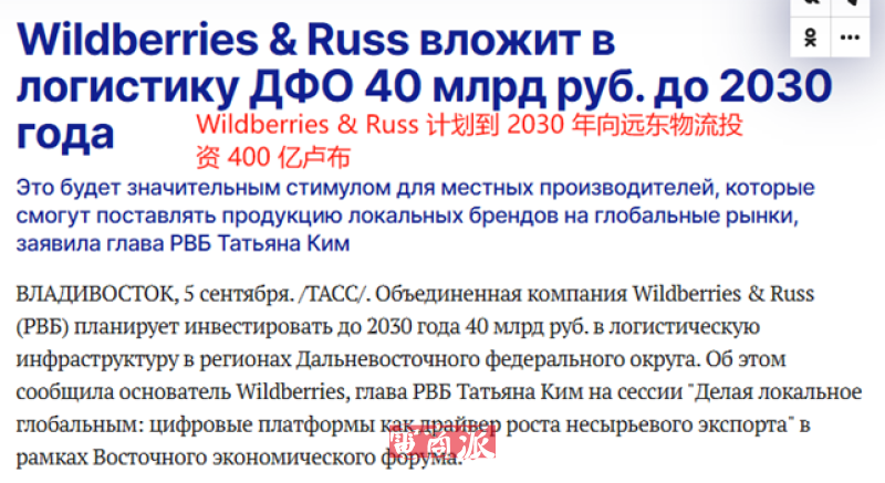 盡管如此,該巨頭依舊沒有停止深耕俄羅斯本土市場,本月初,Wildberries創(chuàng)始人塔季揚娜·金(Tatyana Kim)還在東方經(jīng)濟論壇上宣布,Wildberries和Russ的聯(lián)合公司計劃將在2030年之前在遠東投資400億俄羅斯盧布(約合人民幣34.76億元)用于物流基礎(chǔ)設(shè)施建設(shè)。