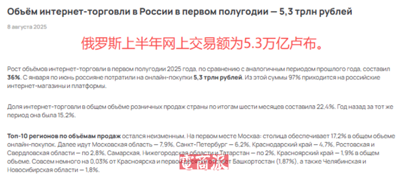 2025年上半年,俄羅斯電商市場規(guī)模持續(xù)擴大,六個月內(nèi)電商交易量達到5.3萬億盧比。按品類劃分,食品雜貨是俄羅斯線上銷售額前五大類商品的榜首,約占總體銷售額的20%;家居用品和家具位居第二,占比達15.7%;其次是服裝鞋類(13.5%)、電子產(chǎn)品和家電(占比12%)以及汽車零部件與配件(6.8%)。